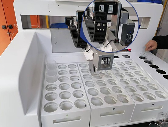 采用發(fā)布進(jìn)口電驅(qū)動(dòng)三軸機(jī)器人運(yùn)動(dòng)臂,代替人工,批量自動(dòng)轉(zhuǎn)移樣品,實(shí)現(xiàn)從待測(cè)區(qū)至試劑添加區(qū)——樣品消解區(qū)——自動(dòng)滴定區(qū)的樣品杯轉(zhuǎn)移。